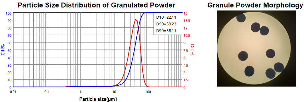 The granulated powder has high purity, large bulk density, excellent sphericity, uniform particle distribution, good fluidity, and is easy to form and demold by dry pressing. The green body has high density and strong bonding force. It exhibits excellent low-temperature firing performance, resulting in small crystal nucleus size, low porosity, high ceramic density, and low shrinkage rate after firing, with superior structural and mechanical properties.